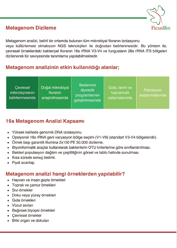 İlgili mikroorganizmaların genlerini çoğaltılıp sayısal hale getirerek veri tabanlarından hangi tür olduğunu tanımlamaya dayalı bir yaklaşım izlemekteyiz. Bu yöntem, "metagenom analizi" olarak bilinmekte olup belirli bir ortamda bulunan tüm mikrobiyal floranın, izolasyonu veya kültürlemesi olmaksızın NGS teknolojileri ile doğrudan belirlenmesidir. Bu yaklaşım ile, çevresel örneklerdeki bakteriyel floranın 16s rRNA V3-V4 bölgeleri ve fungusların 26s rRNA D1D2 bölgeleri dizilenerek tür seviyesinde tanımlama yapılabilmektedir. Hizmet süreci ve TÜBİTAK tarafından desteklenen "Fitomikrobiyom DNA Kiti" ile ortaya çıkmıştır. İlgili hizmet ülkemizde birçok SOCAR, Hektaş, Gübretaş, Nektar Tarım, Egem Gübre, Agroline Tarım, Nobel ilaç gibi kurum, kuruluş ve üniversiteye sunulmuştur. Aşağıda firmamızdan hizmet alarak üretilen makalelerden bazılarını görebilirsiniz;